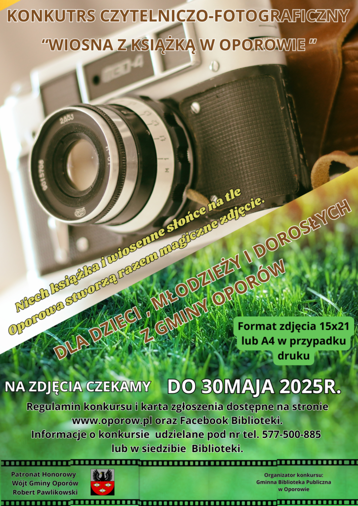 Gminna Biblioteka Publiczna w Oporowie zaprasza wszystkich miłośników książek, fotografii i wiosennych spacerów do udziału w wyjątkowym konkursie „Wiosna z książką w Oporowie”, organizowanym pod Patronatem Honorowym Wójta Gminy Oporów.