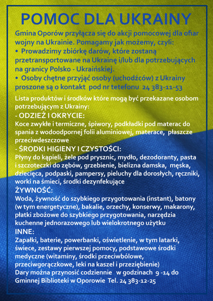 Aktualności Gmina Oporów dołącza się do pomocy dla Ukrainy Data: 1 marca 2022 Kategoria: Bez kategorii