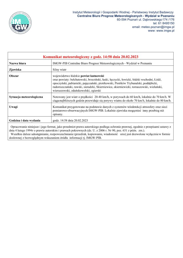 Aktualności Komunikat meteorologiczny z godz. 14:58 dnia 20.02.2023 Data: 20 lutego 2023 Kategoria: Bez kategorii