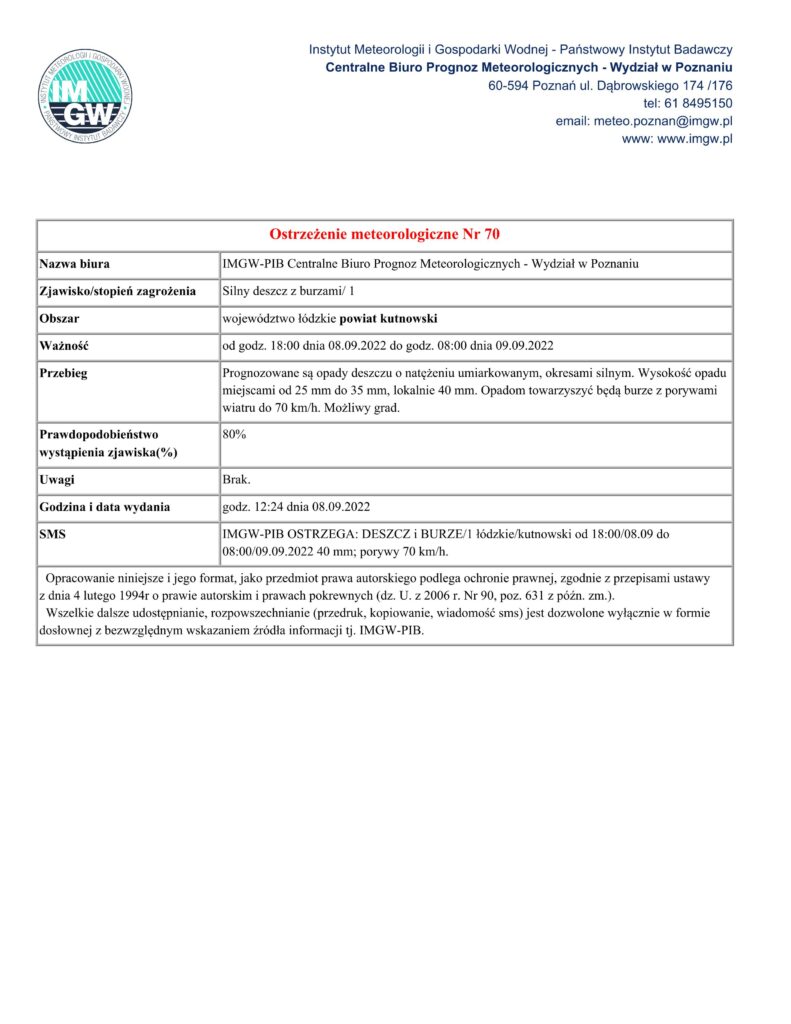 Ostrzeżenie meteorologiczne Nr 70