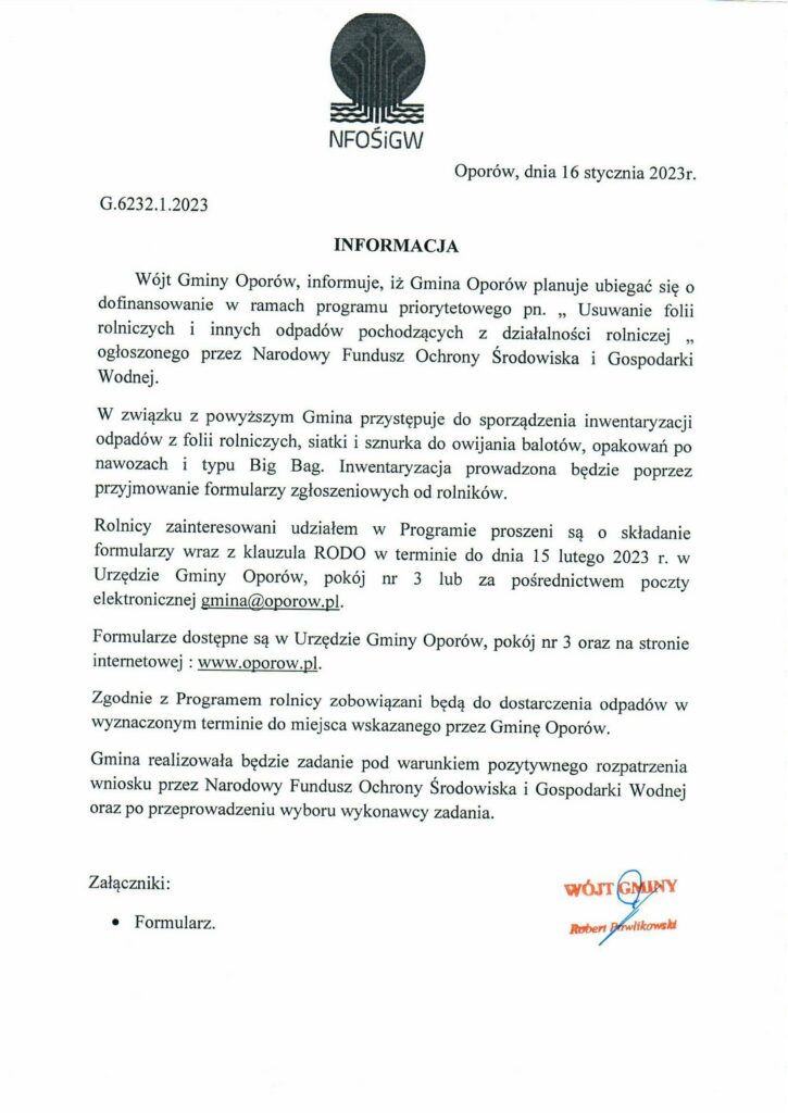 Aktualności Usuwanie folii rolniczych i innych odpadów pochodzących z działalności rolniczej Data: 17 stycznia 2023 Kategoria: Bez kategorii Do pobrania:Wniosek + RODO